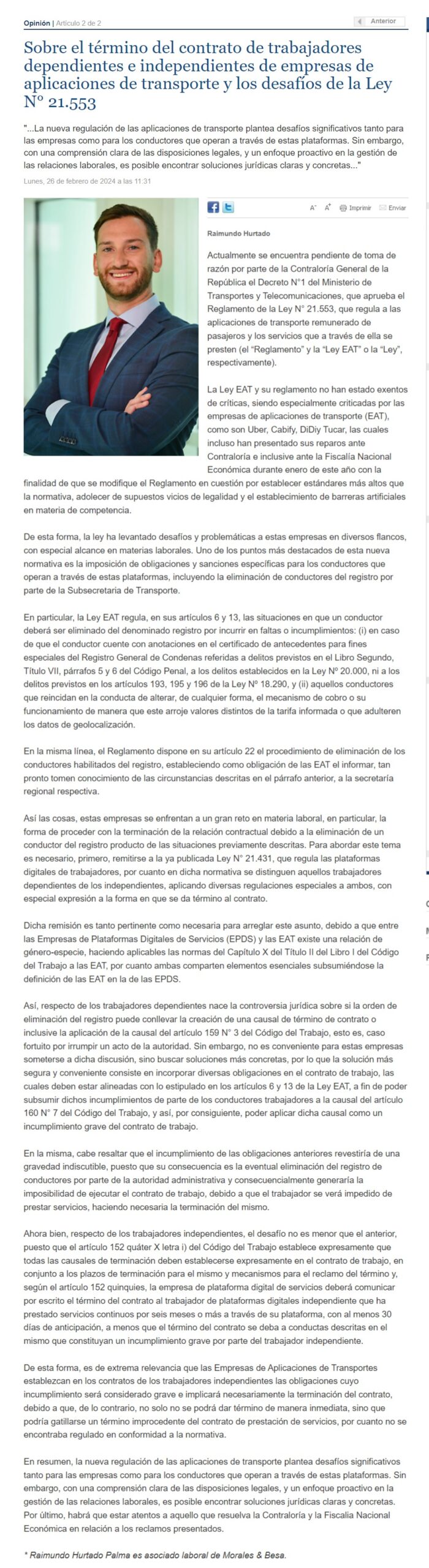 Columna de opinión: Sobre el término del contrato de trabajadores dependientes e independientes de empresas de aplicaciones de transporte y los desafíos de la Ley N° 21.553